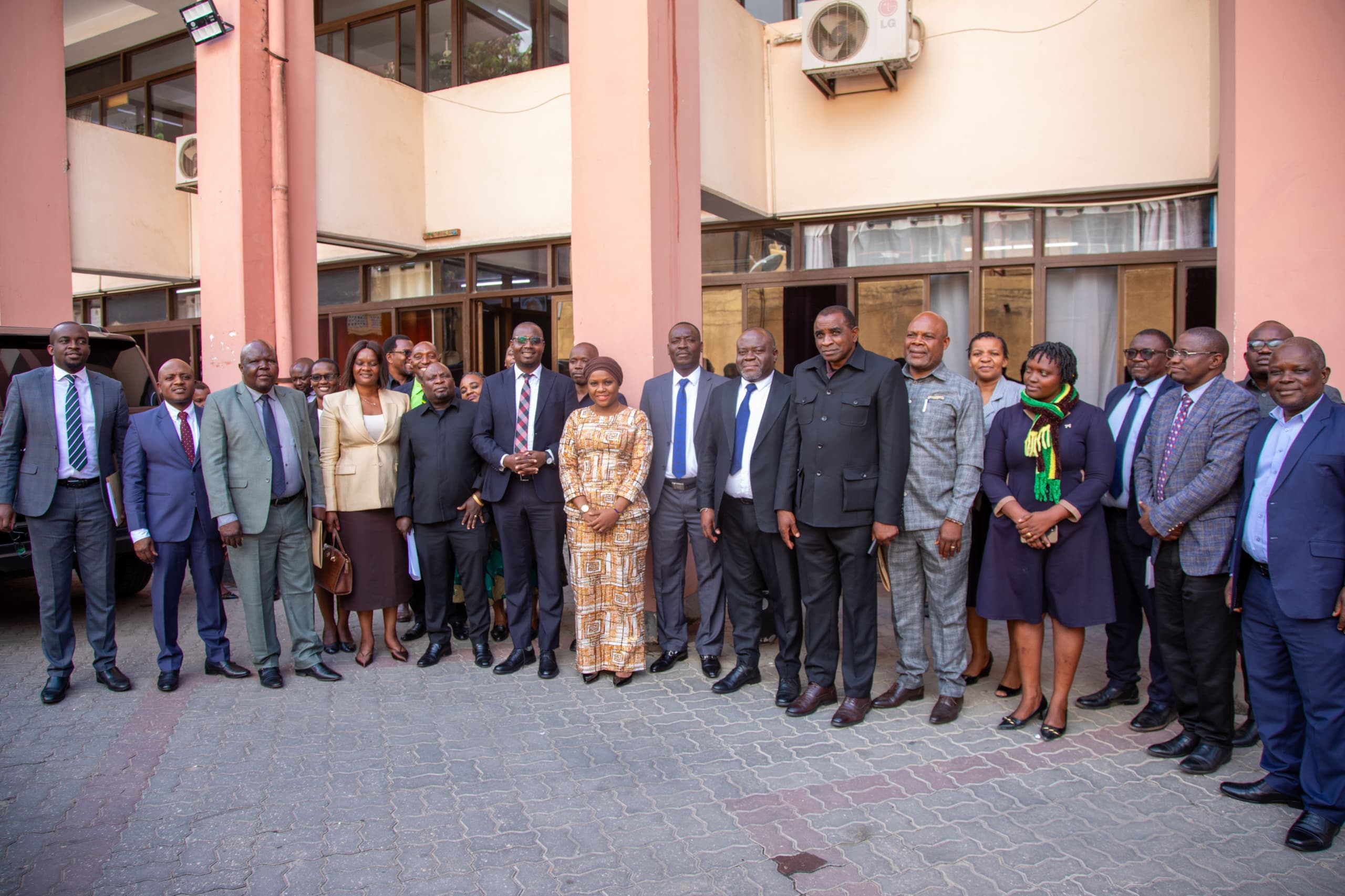 Naibu Katibu Mkuu OR-TAMISEMI (ELIMU) Bw. Atupele Mwambene akiwa katika picha ya pamoja na washindi wa Netibali Taifa - TAMISEMI QUEENS na Viongozi wao ofisini kwake